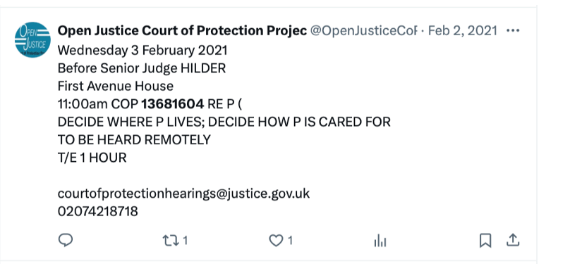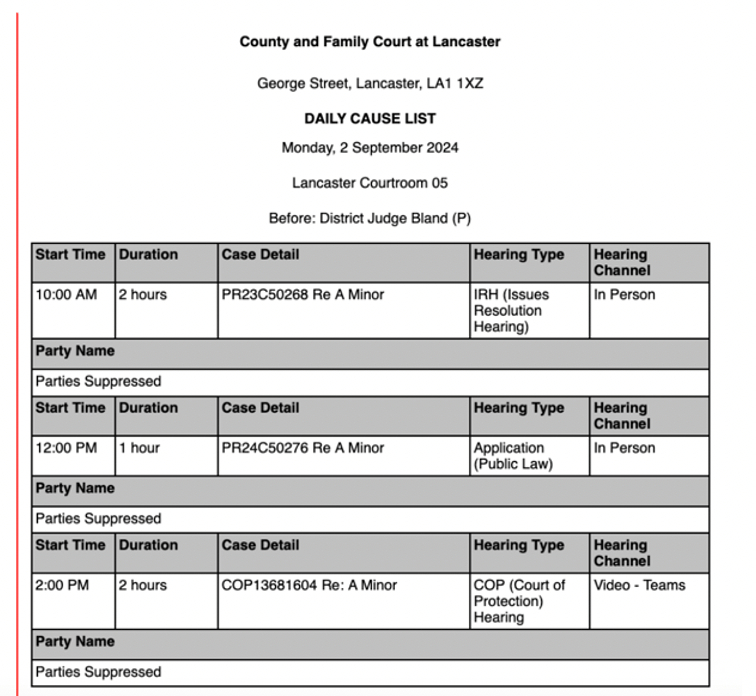 - It appeared only in the Daily Cause List for Lancaster and not in the Court of Protection list which is where it’s supposed to be.