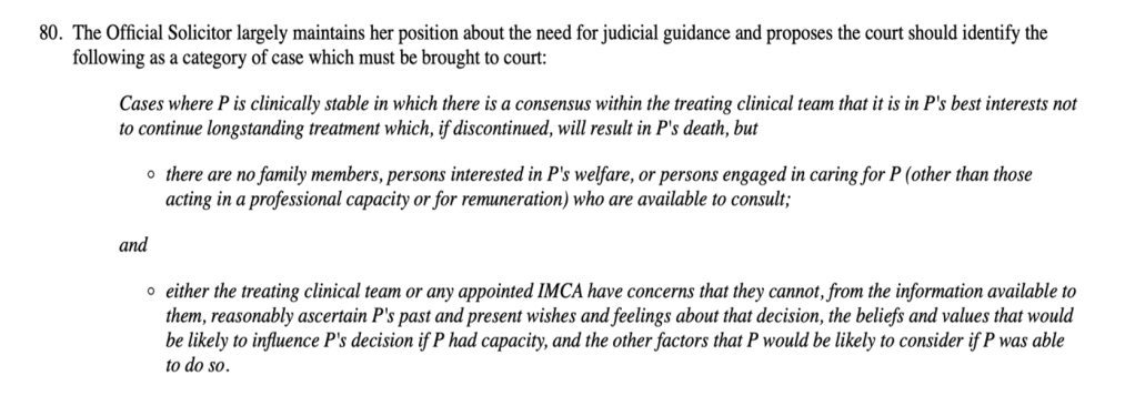 Clearly, a “reduction in the pool of patients who are unlawfully receiving continued longstanding life-sustaining treatment by default because of an absence of family or friends to consult” could only be achieved if the category of cases which “must” be brought to court were composed not only of those cases where there is a consensus within the treating clinical team that it is in Ps best interests not to continue life-sustaining treatment (as suggested in para 80), but also those cases in which the treating clinical team have adopted the position that (since family and friends are not available to argue a contrary position), treatment should simply continue indefinitely.