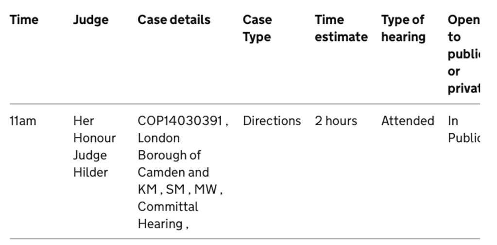 The list names the applicant (the London Borough of Camden) – albeit not as the applicant – but it does not name the defendant, the alleged contemnor. There is a list of initials but it’s not possible from this listing to know which of the persons referenced with initials is the defendant.