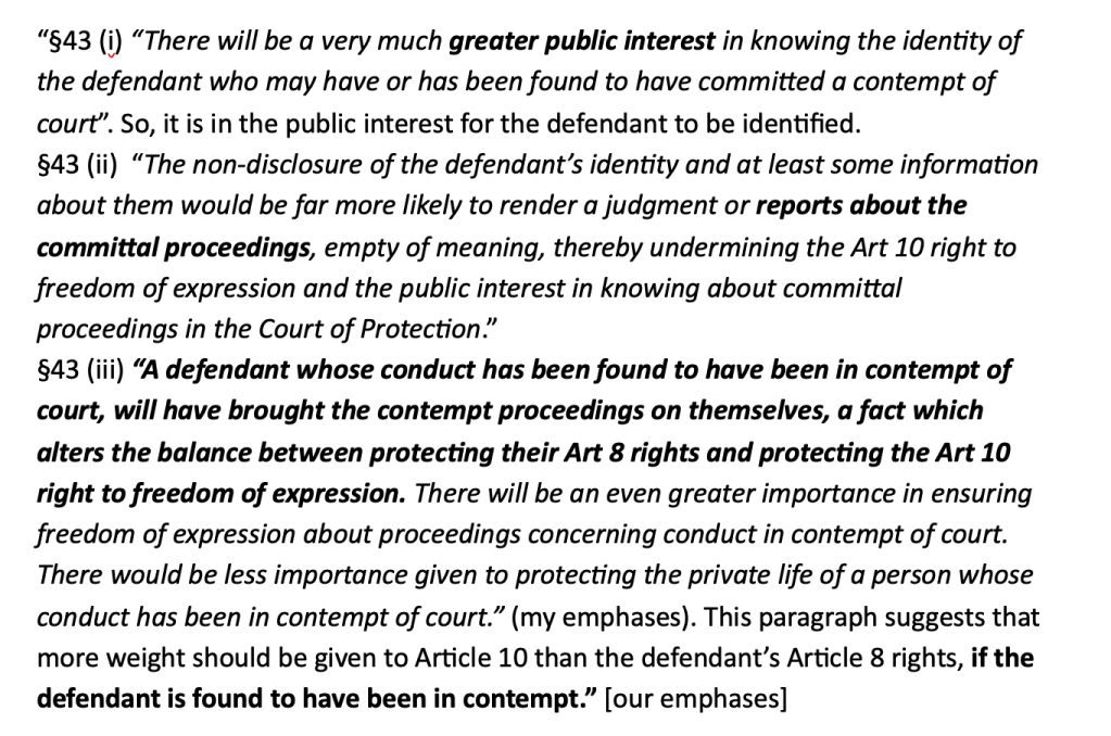 9. It is difficult to make an argument for disclosure of a contemnor’s name without knowledge of why the contemnor (MW in this case) is said to meet criteria for non-disclosure. As far as we are aware, there is no public order or judgment explaining the reasoning for ordering non-disclosure. In Esper §54 (ix): regarding not naming the defendant in order to protect P: “COPR r21.8(5) is not triggered to prevent the disclosure of the identity of the defendant if the sole purpose is to protect the interests of P. It must be the interests of the defendant that need protecting.” [my emphasis]. We submit that, given that the Esper judgment stresses that this should occur only ‘extremely rarely’, and particularly if the defendant is found to have committed contempt, HHJ Hilder should justify with her reasons why the defendant’s identity should not be disclosed in order to ‘protect the interests of the party or witness’.