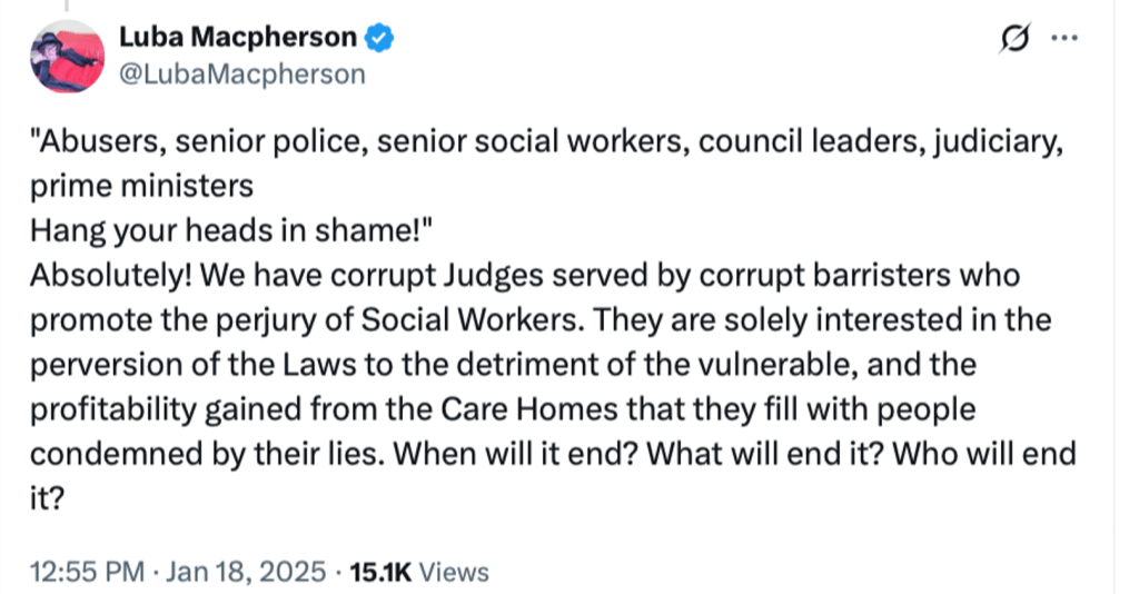 She has posted prolifically on social media about her outrage regarding the entire court, health and social care system – and she’s developed networking skills to build links with other justice campaigners and has attracted many supporters (see sample social media posts below).