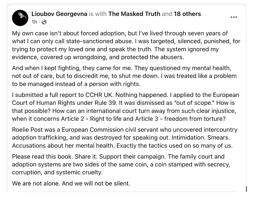 Claire Martin’s blog is one of the most robust, respectful, and intellectually honest assessments of my case that I’ve seen. It treats me not as a problem to be managed, or a diagnosis to be explained away, but as a person with convictions, evidence, and a right to be heard. For once, I am not portrayed as a “difficult mother,” but as a thinker, a litigant, and a witness to systemic failure.