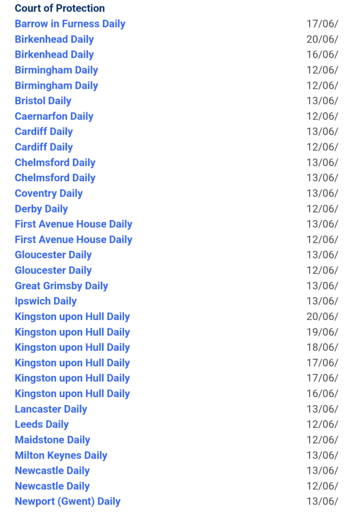The hearing on 12th June wasn’t included (at all) anywhere on CourtServe. It wasn’t in the Court of Protection list. Nor was it on the Derby Daily Cause List. Of course, I can’t show something that wasn’t there – but I can show where the case should have been.