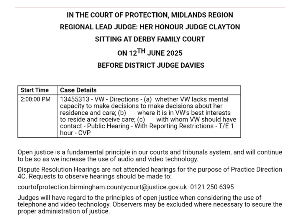 I knew that this case was being heard on this date because I had observed a hearing/meeting on 2nd June 2025. However, the case was not listed in either the CourtServe Court of Protection list or the Derby Daily Cause List. This means that, but for my prior knowledge, the case would have essentially been heard in private.