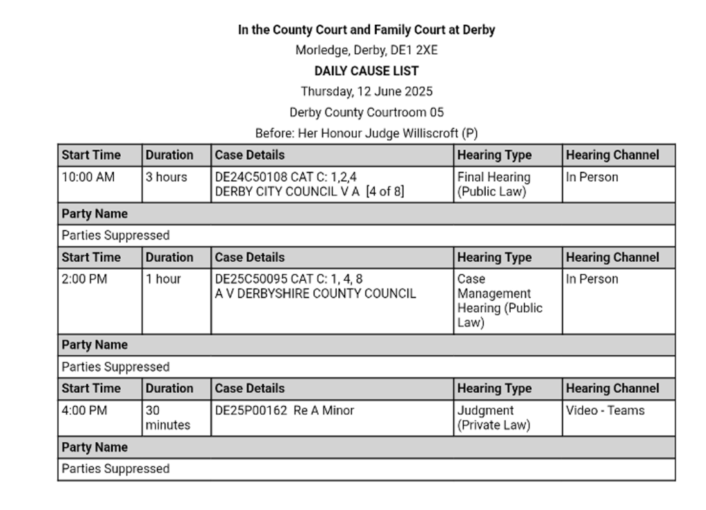 Sometimes, Court of Protection cases are in the local court’s Daily Cause List as well as, or instead of, appearing in the Court of Protection list. So, I looked there too, and could see that HHJ Williscroft was predominantly presiding over family court cases on the 12th June 2025. Here’s her published list for that date: