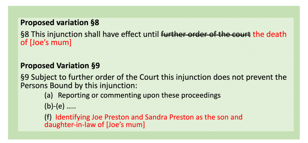In response to 2.2 (“Please set out the grounds on which you are seeking the order or direction” Joe wrote: “In the particular circumstances of this case, variation of the Transparency Order in the proposed terms strikes the right balance of my own and my wife’s ECHR Article 10 right to freedom of speech (and the public’s Article 10 right to freedom of information) with [my mother’s] ECHR Article 8 privacy rights. See attached.”