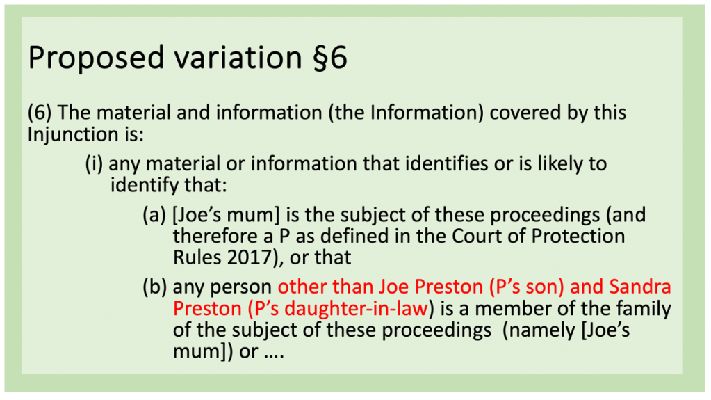 In the attached document, Joe further specified that “The intended effect of varying §6 is to permit identification of myself and my wife as [P’s] son and daughter-in-law. It is not intended to permit identification of P (e.g. by name), or where she lives or is cared for, nor is it intended to permit identification of professionals involved in this case”. He then set out the proposed variations. I’ve illustrated them here by reproducing the original text of the order and adding in red the changes Joe was asking for. (If you have your own transparency order, you might want to look at it now and see how it would need to be amended to achieve the effect YOU would like to happen.)