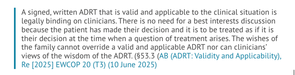 Since the judge had already handed down a judgment confirming the validity and applicability of the advance decision to refuse treatment (Re AB (ADRT): Validity and Applicability) [2025] EWCOP 20 (T3), the court’s acceptance that it was authentic as well meant that the ADRT was now constituted as AB’s own legally binding decision. This meant that it was not open to the court to make a ‘best interests’ decision about life-sustaining treatment – because AB had already made his own advance decision in accordance with §§24-26 Mental Capacity Act 2005. A valid, applicable, and authentic ADRT means that it is unlawful to continue any treatment that has been refused – and that included, in AB’s case, clinically assisted nutrition and hydration.