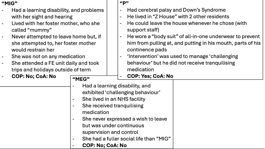MIG and MEG were sisters, though they lived separately. P had no connection to either sister, and was older than them. In April 2025, I gave a talk about DoLS at the Socio-Legal Studies Association Annual Conference. Here’s my slide that set out the differences between the three protected parties.