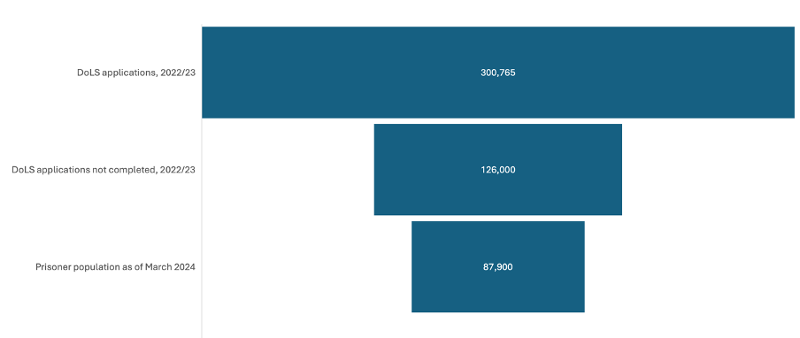 A report published by Age UK has analysed the current DoLS system. In 2022/23, there were 300,765 DoLS applications. The average wait time for an assessment was 156 days. Of those applications, 126,000 were not completed. By contrast, the prisoner population of England and Wales in 2024 was 87,900. To illustrate that point, here’s a graphic I created for the talk I gave in April 2025.
