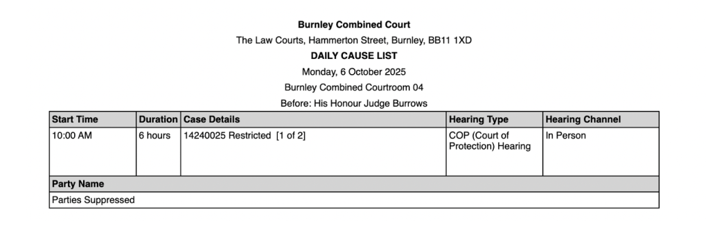 [2] It was incorrectly listed by HMCTS, contrary to the explicit instructions of the judge (as he explained to me when I raised the matter). I have since complained to HMCTS, noting that this is a frequent problem with committals. Here’s how it was listed – without any indication at all that it was a committal to prison, and entirely without reference to the Practice Guidance on how committals should be listed. This hearing was also not included in the COP lists (only in the daily cause list for Burnley). This is a complete failure of transparency. (It was subsequently – briefly – correctly listed, including the defendants’ names, for the following day, but seems then to have been removed from the list altogether, presumably because the hearing on 7th October 2025 was ‘without notice’ to the defendants.)