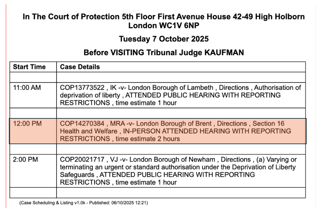 I am not sure why P would find it hard to attend court in the morning, and his counsel had earlier alluded to him struggling to engage with the court, despite wishing and intending to do so. For whatever reason, it sounded like an afternoon hearing was likely to accommodate his needs. That wasn’t what was offered, however, and we have seen that the case has been listed at an earlier date, and still for a morning hearing, on Monday 17th November 11am, via remote link. If you’d like the link to observe email: courtofprotectionhearings@justice.gov.uk with the case number COP 14270384.