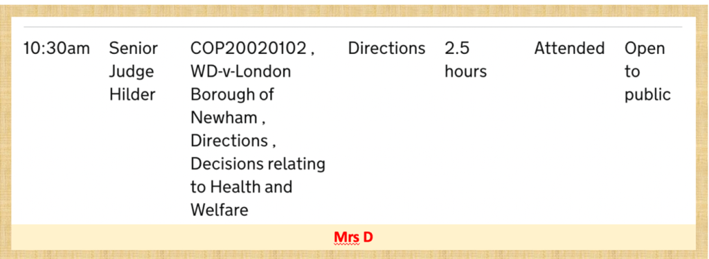 Mrs D, a widow aged 96, is living in her matrimonial home with one of her six (surviving) children, three of whom are parties to these proceedings, all as litigants in person. There are also eight or nine members of Mrs D’s family in court, including in-laws and grandchildren. It’s a crowded courtroom! Counsel for the local authority (London Borough of Newham) and counsel for Mrs D via her litigation friend the Official Solicitor are also in attendance[5].