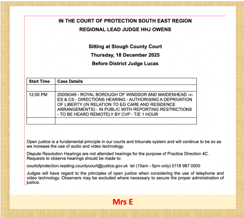 [6] I was alerted to this hearing by Claire Martin who has observed two previous hearings (and shared her notes with me) and asked me to observe this one because she was concerned about how Mrs E’s daughter is being represented to the court, and the likely consequences for her and for her mother of the way these proceedings are conducted. Having watched the December hearing, I share those concerns.