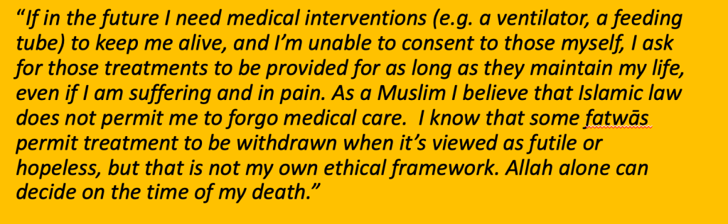 I don’t know for sure that AH would want ventilation withdrawn, given the tenets of her faith – but as Mr Justice Hayden points out (paras. 93 and 94 of the judgment), “on these difficult end of life issues there are differing views within each of the major faiths, including within Islam”.