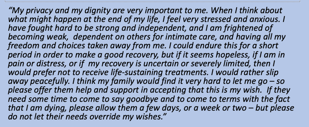 We can also avoid ‘best interests’ decision-making altogether by making a legally-binding refusal of treatment. With a formal ‘advance decision’ (signed, witnessed and with some specified wording, see ss. 24-26, MCA), we can make our refusals known (e.g. “I refuse a feeding tube if I have advanced dementia”, “I refuse a ventilator if I’ll never be able to live independently again”). These are legally binding – doctors cannot lawfully administer the treatments refused in a valid and applicable advance decision.