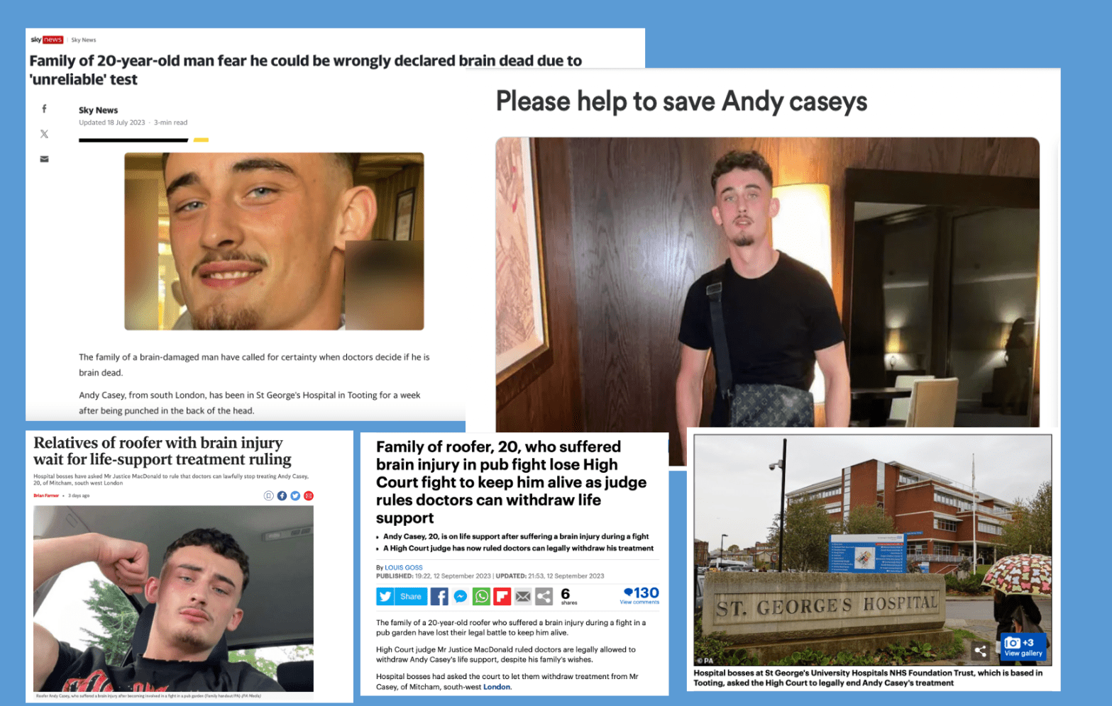 By Celia Kitzinger, with Brian Farmer, 24 September 2023 On 9th July 2023, Andy Casey – then a healthy young man – was on a night out when he was assaulted in a pub garden. He was punched on the right side of his head and fell to the ground, with catastrophic injury to his brain. AnContinue reading “‘The horse has already bolted’: Transparency in a case of “brain-stem death””