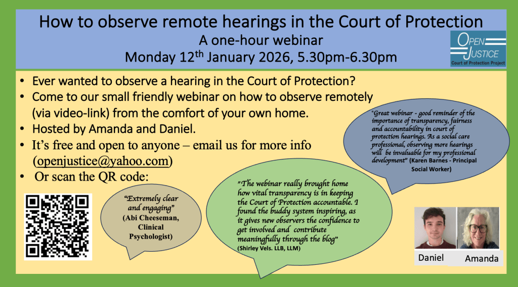 Our next ‘How to observe remote hearings in the Court of Protection’ webinar is will be Monday 12th January 2026, from 5.30pm – 6.30pm, hosted by Amanda Hill and Daniel Clark. Send an email to openjustice@yahoo.com if you want to be added to the attendance list.